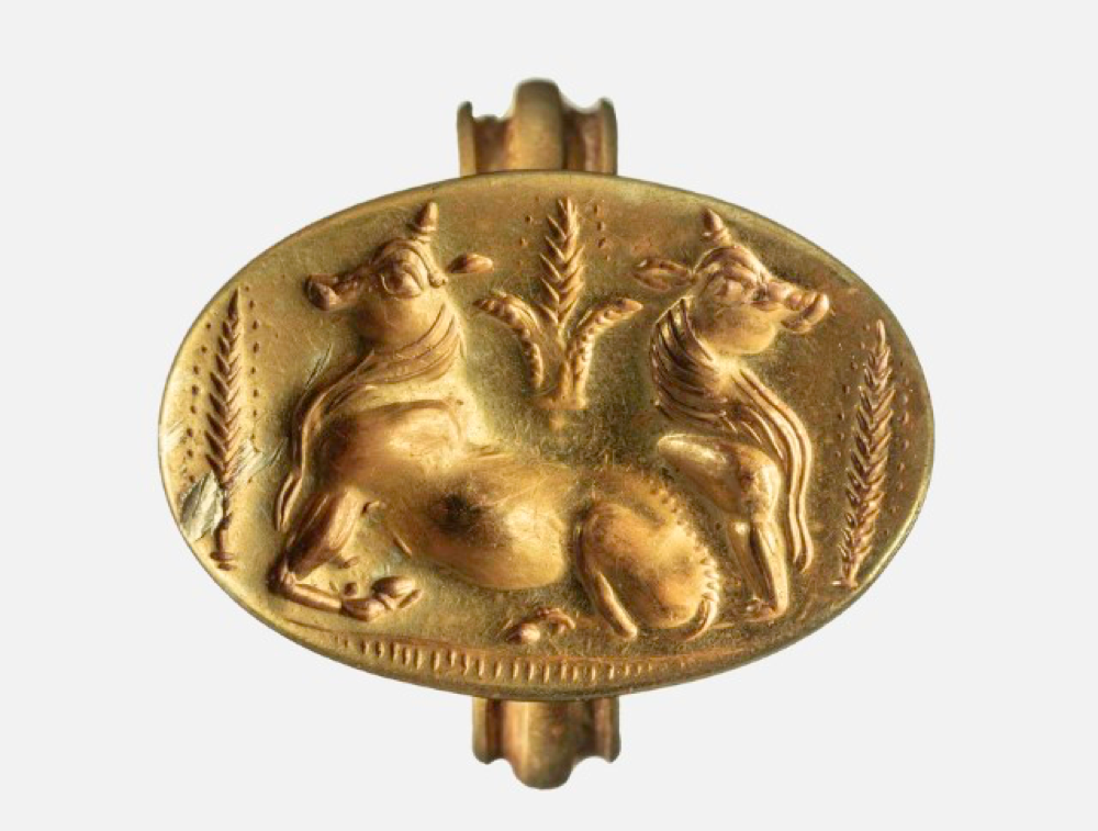 Ανάμεσα στα πιο συναρπαστικά νέα ευρήματα συγκαταλέγεται ένα χρυσό δαχτυλίδι, το οποίο απεικονίζει δύο βοοειδή που πλαισιώνονται από στάχυα κριθαριού, όπως αναγνωρίστηκε από την καθηγήτρια Ιστορίας και Αρχαιολογίας του ΑΠΘ, Τάνια Βαλαμώτη, και ένα χρυσό μενταγιόν που απεικονίζει την κεφαλή της Αιγύπτιας θεάς ‘Αθωρ.