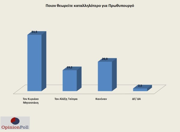 Μεγάλο είναι το προβάδισμα του πρωθυπουργού και στην ερώτηση «Ποιον θεωρείται καταλληλότερο για πρωθυπουργό», με τον Κυριάκο Μητσοτάκη να βρίσκεται στην πρώτη θέση των προτιμήσεων των πολιτών με ποσοστό 51,5%.