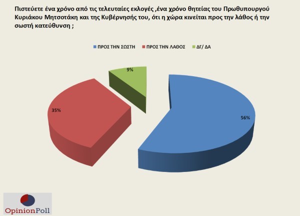 Θετική είναι η άποψη της πλειοψηφίας των πολιτών και για την πορεία της χώρας, έναν χρόνο μετά τις εκλογές της 7 Ιουλίου 2019, καθώς ποσοστό 56% θεωρεί πως η χώρα κινείται προς την σωστή κατεύθυνση, ενώ το 35% θεωρεί πως κινείται προς την λάθος κατεύθυνση.