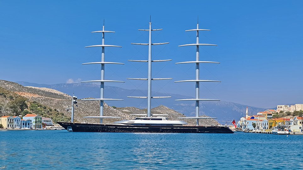 Στο Καστελόριζο η Ελληνοκύπρια επιχειρηματίας Ελενα Αμβροσιάδου με το τερατώδες σε μέγεθος σκάφος της «Maltese Falcon» – Δείτε βίντεο