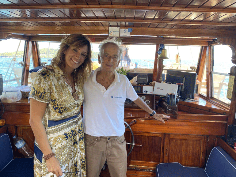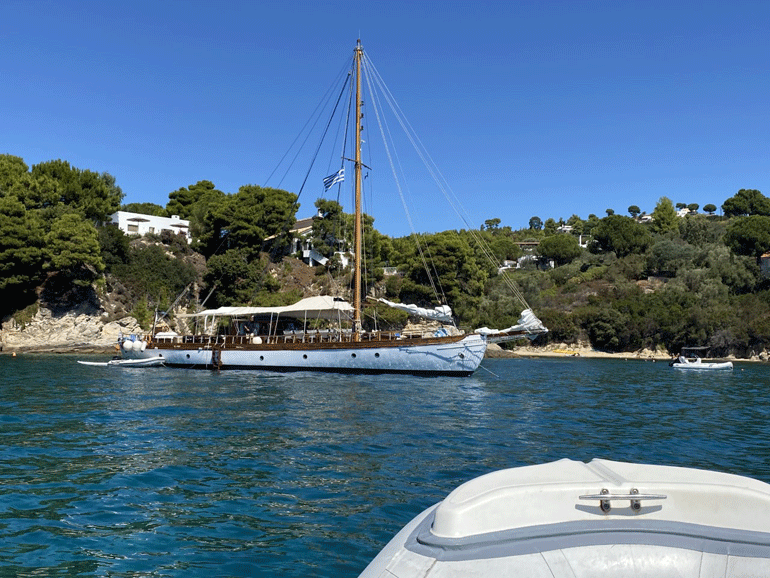 Σε μία ξεχωριστή για εμάς εμπειρία μέσα από τη γνωριμία μας με την ομάδα αθλητικών δραστηριοτήτων «Diolettas watersports»… γνωρίσαμε την μεγάλη οικογένεια της «κρουαζιέρας» απολαμβάνοντάς τους να κάνουν θαλάσσιο σκι με την ομάδα στην παραλία των Κουκουναριών της Σκιάθου. Αφού τους γνωρίσαμε, η φιλοξενία που ηχεί στους «επιστήθιους παλμούς της Ελληνικής ρίζας του Ανδρέα Ποταμιάνου» μας βρήκε με θερμή υποδοχή απο τον επι 40 χρόνια συνεργάτη του κου Αντρέα καπετάν Βασίλη ο οποίος μας παρέλαβε με φουσκωτό για να μας μεταφέρει ιπποτικά στο Ιστιοπλοικό ιστορικό σκάφος «Θελγίνος»(1926) του κου Ανδρέα ο οποίος και μας περίμενε.
