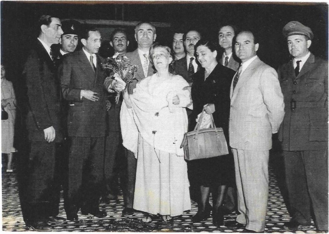 1952 Η Εύα επιστρέφει στην Ελλάδα. Την υποδέχονται στο αεροδρόμιο Ελευσίνας οι Δελφιώτες aπό αριστερά Αλέξανδρος Ζαφειρόπουλος, Νικόλαος Κωλέττης ,Ιωάννης Μπακαρίνος προσφέρει την ανθοδέσμη, Γεώργιος Κουνούπης , Φοίβος Δέλφης ( Γεώργιος Κανέλος) με μέτρα ασφαλείας γιατί……………..