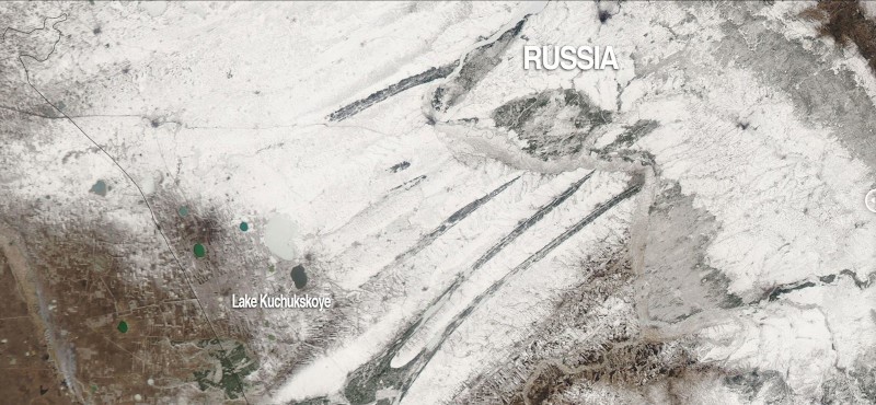 Άνοιξη στη στέπα Κουλούντα στα σύνορα Ρωσίας – Καζακστάν. Η πάνω φωτογραφία ελήφθη τον Απρίλιο και η κάτω δύο μήνες αργότερα / Φωτογραφίες: NASA