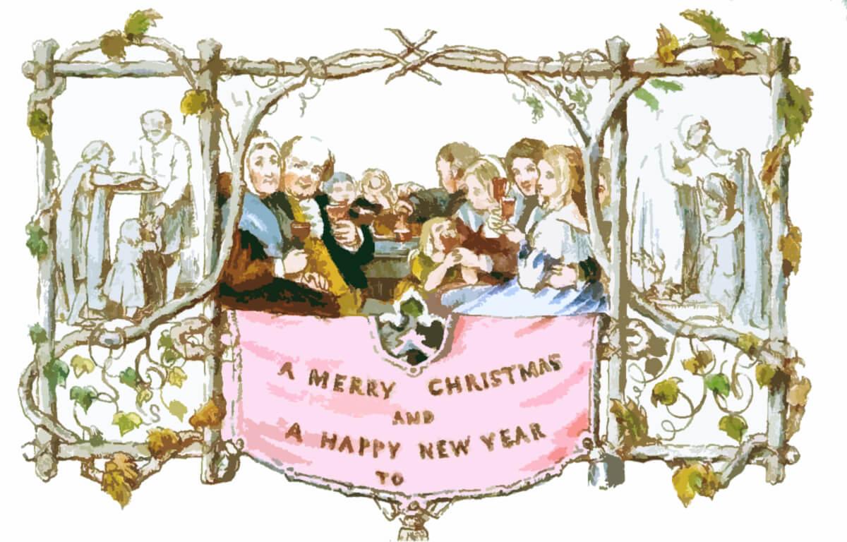 Η τυπωμένη ευχετήρια κάρτα υπήρξε έμπνευση του Sir Henry Cole (1808-1882), βρετανού κυβερνητικού λειτουργού και εφευρέτη. Τη σχεδίασε το 1843 ο φίλος του John Horsley. Η χριστιανική αγάπη αποτυπώνεται στις καλές πράξεις: σίτιση πεινασμένων (αριστερά), προσφορά ρούχων σε φτωχούς (δεξιά). Επικρίθηκε έντονα η απεικόνιση μικρού παιδιού που πίνει κρασί, αυτό όμως συνέβαλε στην τεράστια εμπορική επιτυχία της κάρτας η οποία κόστιζε μόνο ένα σελίνι, 12 σημερινές πένες. Από τις 2.050 κάρτες που τυπώθηκαν σώζονται μόλις 21. Το 2001 πουλήθηκε σε δημοπρασία μία από αυτές στην τιμή των 22.500 λιρών Αγγλίας.