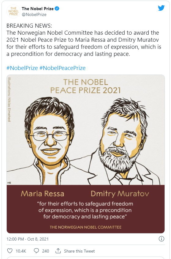 Σε δύο δημοσιογράφους, τη Μαρία Ρέσα και τον Ντμίτρι Μουράτοφ, απονεμήθηκε το Νόμπελ Ειρήνης 2021 από τη Νορβηγική Επιτροπή.