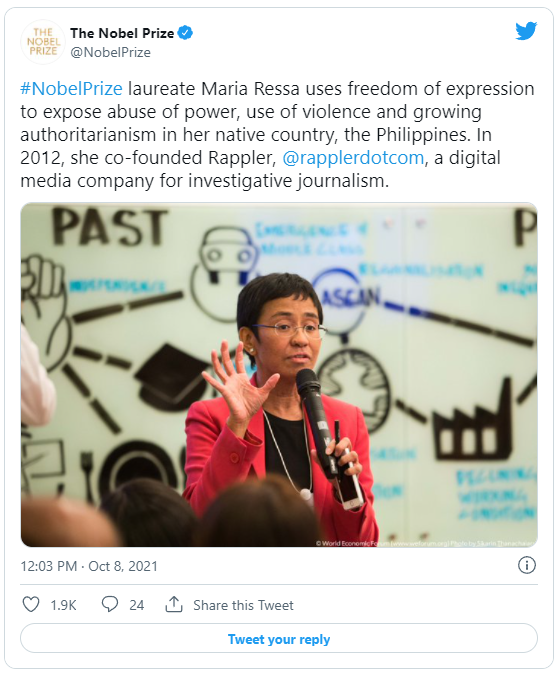Τον περασμένο χρόνο η Ρέσα καταδικάστηκε για κυβερνο-λιβελογράφημα βάσει αμφιλεγόμενου νόμου στην πατρίδα της κατά των κυβερνο-εγκλημάτων, που οργανώσεις προάσπισης των ανθρωπίνων δικαιωμάτων και δημοσιογράφοι χαρακτήρισαν επίθεση στην ελευθερία του Τύπου. Η Rappler που ίδρυσε η Ρέσα το 2012 «έχει εστιάσει την προσοχή στην αμφιλεγόμενη, φονική εκστρατεία κατά των ναρκωτικών του καθεστώτος του [προέδρου των Φιλιππίνων] Ντουτέρτε, ανέφερε η Νορβηγική Επιτροπή προσθέτοντας ότι η Ρέσα και το Rappler «κατέγραψαν επίσης πώς χρησιμοποιούντα τα μέσα κοινωνικής δικτύωσης για τη διασπορά ψευδών ειδήσεων, την παρενόχληση αντιπάλων και τη χειραγώγηση του δημόσιου διαλόγου».