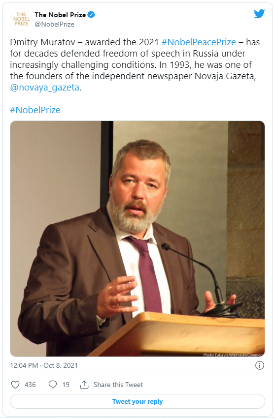 Ο Ντμίτρι Αντρέιβιτς Μουράτοφ είναι Ρώσος δημοσιογράφος, αρχισυντάκτης της ρωσικής εφημερίδας Novaya Gazeta, που έχει ανακηρυχθεί από την Επιτροπή Προστασίας Δημοσιογράφων ως «η μόνη πραγματικά κριτική εφημερίδα με εθνική επιρροή στη Ρωσία σήμερα». Ο Μουράτοφ είχε κερδίσει το 2007 το Βραβείο Ελευθερίας Διεθνούς Τύπου για το θάρρος του στην προάσπιση της ελευθεροτυπίας παρά τις επιθέσεις, απειλές και τη φυλάκιση. Η Νορβηγική Επιτροπή επεσήμανε ότι «οι δύο νικητές εκπροσωπούν όλους τους δημοσιογράφους, που αγωνίζονται για αυτό το ιδεώδες σε έναν κόσμο, όπου η δημοκρατία και η ελευθερία του Τύπου αντιμετωπίζουν ολοένα και συχνότερα αντίξοες συνθήκες». Η απονομή του βραβείου θα γίνει στις 10 Δεκεμβρίου, την ημερομηνία θανάτου του Άλφρεντ Νόμπελ.