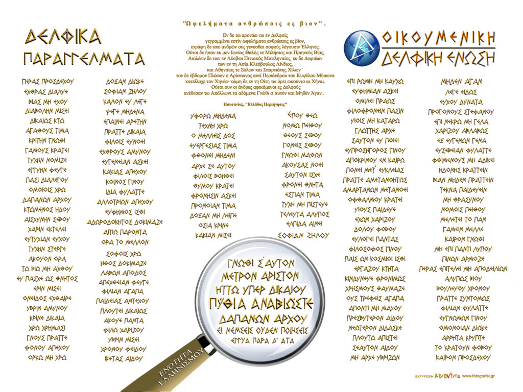 Η φράση του Παυσανία στα Φωκικά του «Εν δε τω προνάω τα εν Δελφοίς γεγραμμένα εστιν ωφελήματα ανθρώποις» είναι χαρακτηριστική της αξίας που έδιναν οι πρόγονοί μας στις «εντολές», στους κανόνες του δικού τους πολιτισμού και της δικής τους ανώτερης θεώρησης των πραγμάτων.